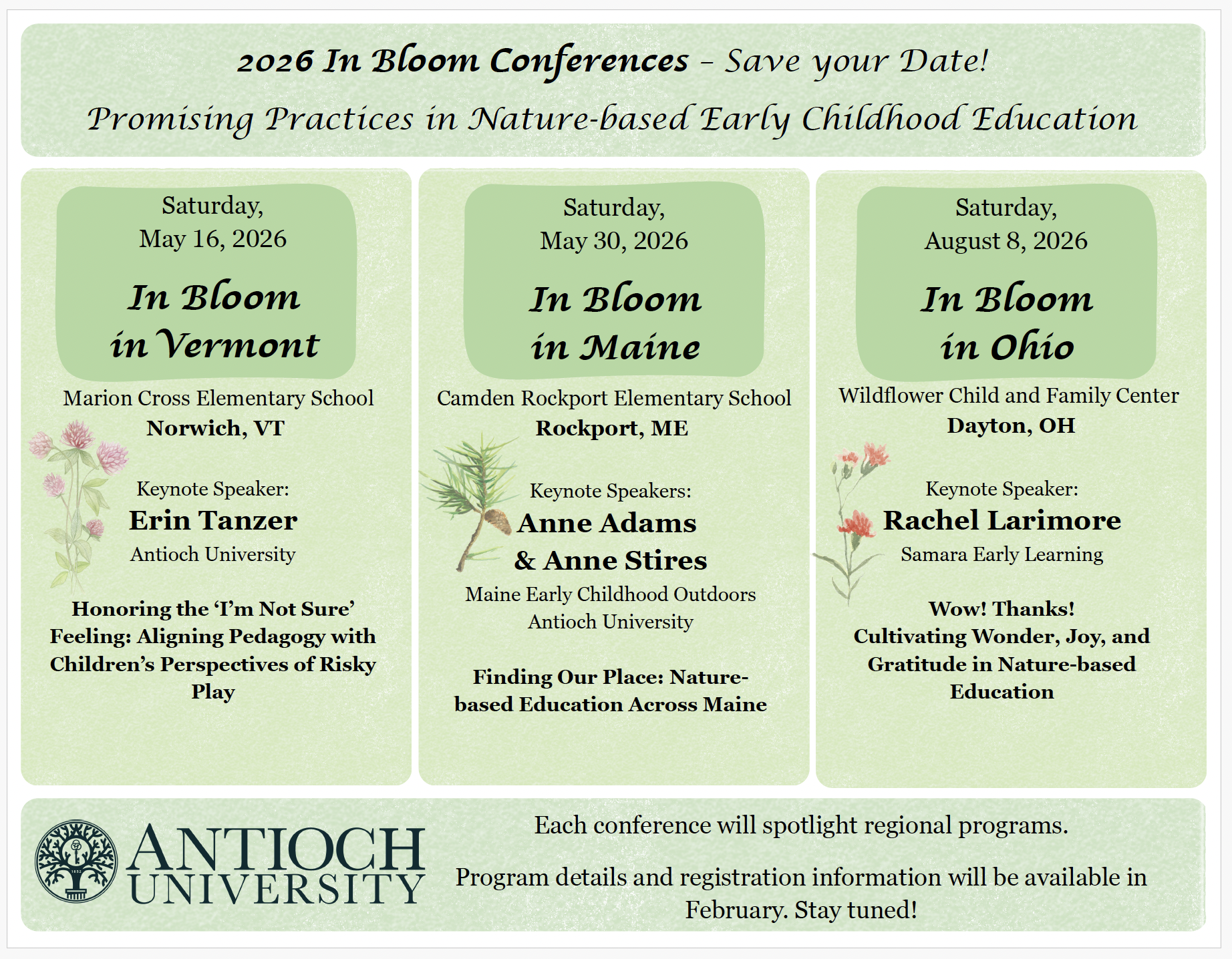 Mark your calendars for the In Bloom in Ohio hosted by Antioch University. Samara’s Dr. Rachel Larimore will be the keynote speaker presenting a talk titled, “Wow! Thanks! Cultivating Wonder, Joy, and Gratitude in Nature-based Education”